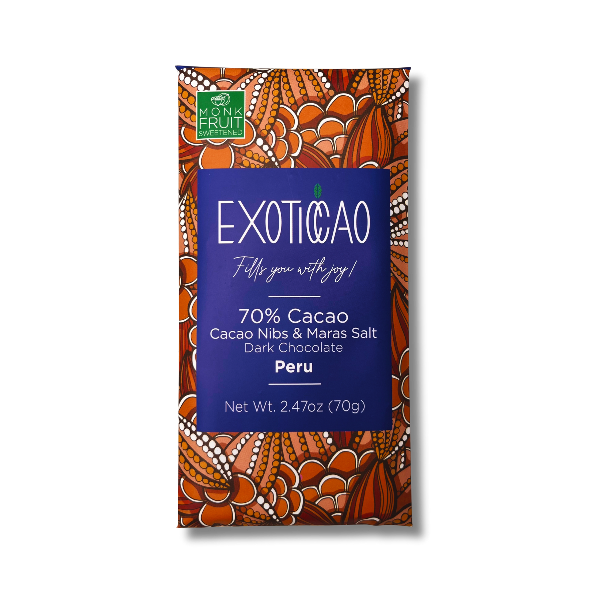 A new form of joyful energy has arrived. Taste the sweet, bitter, and salty sensation like no other chocolate bar in the world and live a unique experience of exotic flavors! Exoticcao has transformed Peru's trendiest Sal de Maras into a chocolate bar with extra Cacao Nibs. It’s 100% natural, nutritious, extremely delicious, and, of course, full of joyful energy!*
