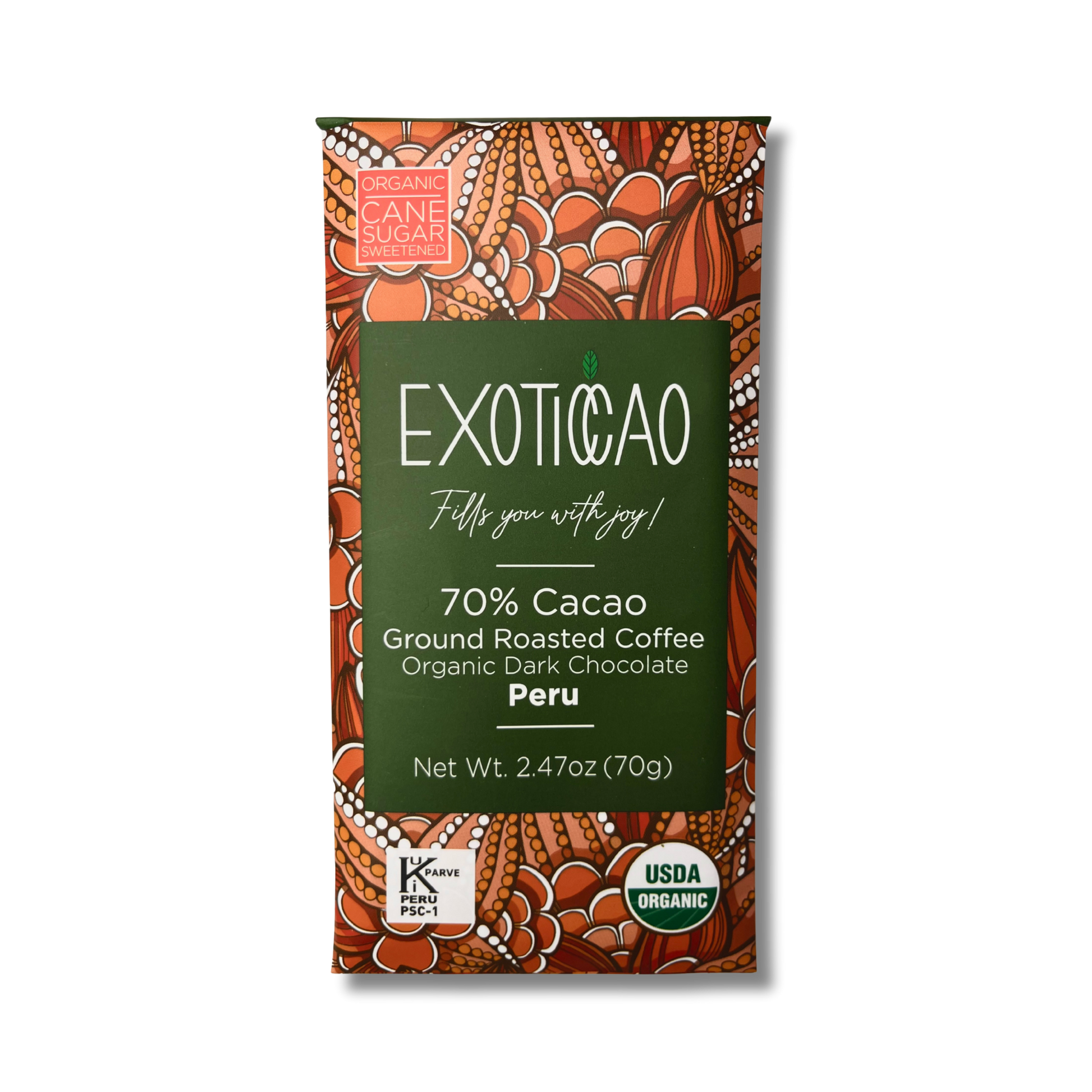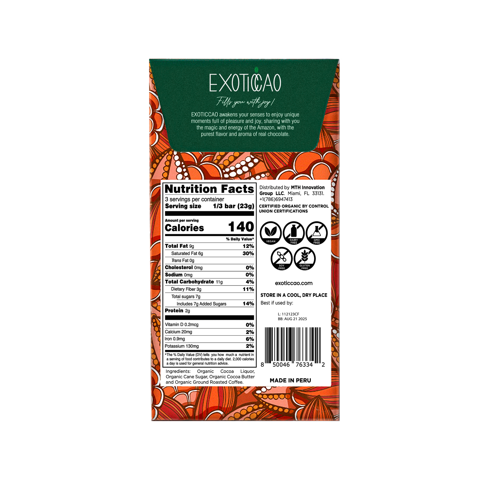 Our premium dark chocolate, infused with roasted coffee pieces, delivers a delicious and healthy boost. Savor the perfect harmony of rich chocolate and aromatic coffee, crafted to invigorate your senses and elevate your mood. Energize your day with EXOTICCAO's Organic Dark Chocolate Ground Roasted Coffee!*