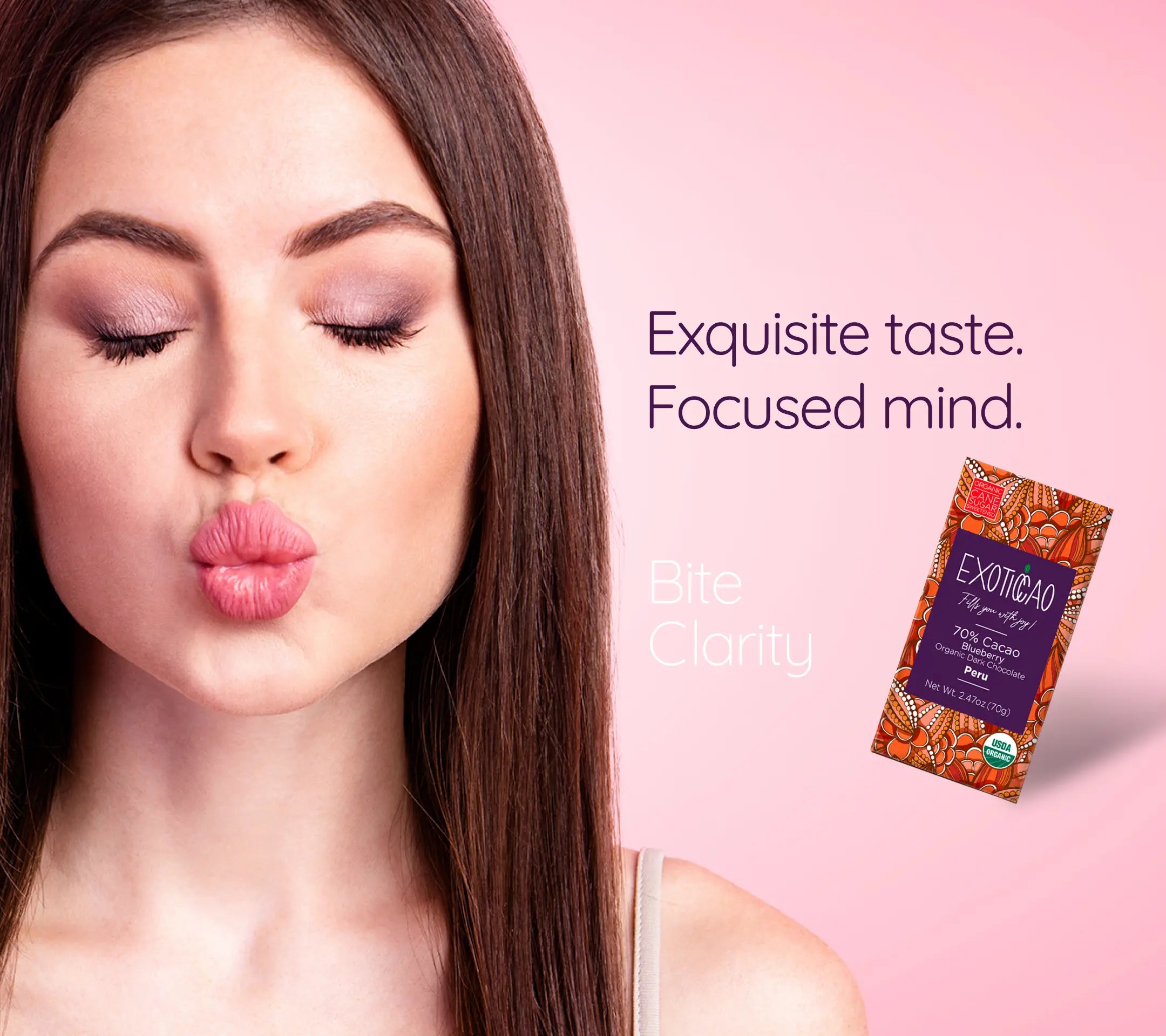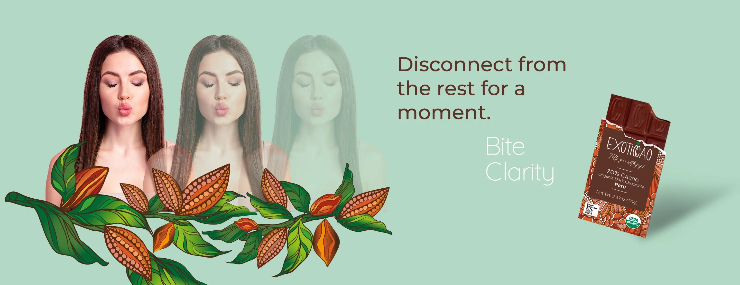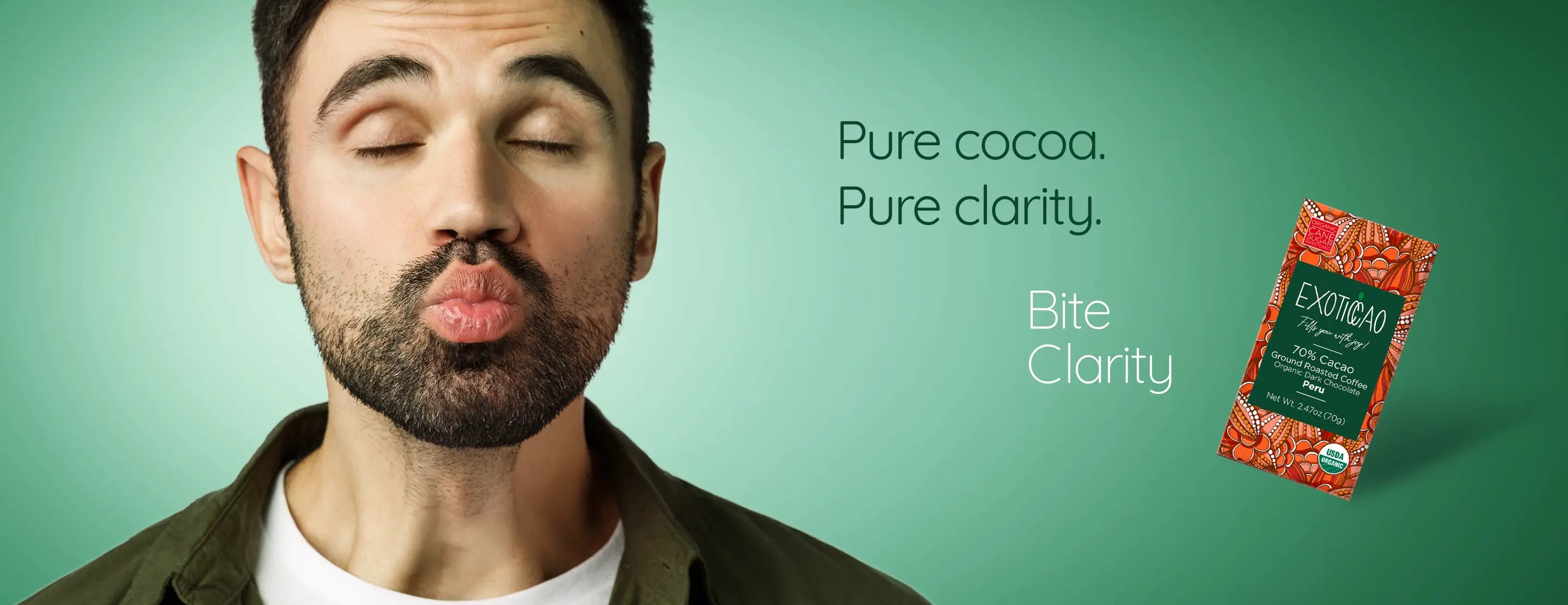 At Exoticcao, our purpose is to help you disconnect from the world and reconnect with yourself for a few seconds through the taste and aroma of our authentic dark chocolate. In that moment of pure pleasure, you'll find the clarity to see life differently, with more openness, positivity, and focus.